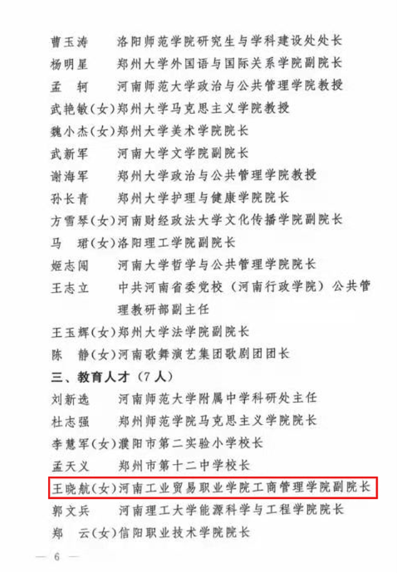 王曉航,現(xiàn)任我校工商管理學(xué)院副院長,教授,高級經(jīng)濟師,一級人力資源管理師。全國模范教師,中原千人計劃——中原領(lǐng)軍人才,享受河南省政府特殊津貼專家,河南省高層次人才(B類),河南省優(yōu)秀教師,河南省教育廳學(xué)術(shù)技術(shù)帶頭,河南省黃大年式教師團隊帶頭人。全國人力資源與社會保障專業(yè)行指委委員,河南省人力資源開發(fā)研究學(xué)會常務(wù)理事,河南省政府PPP評審專家,鄭州市航空港區(qū)投資審計專家。近年來,主持建設(shè)一門國家級教學(xué)資源庫課程,一門省級精品在線開放課程,一門省級立體化教材,一項省級課程思政示范項目,2項河南省高等教育教學(xué)改革研究項目,主持省、廳級課題十余項,發(fā)表論文二十余篇,其中核心期刊十篇。帶隊參加比賽,獲得全國職業(yè)院校技能大賽二等獎1項,省賽一等獎3項,連續(xù)4次獲得河南省優(yōu)質(zhì)課一等獎,3次獲得河南省職業(yè)教育教學(xué)改革成果一等獎。