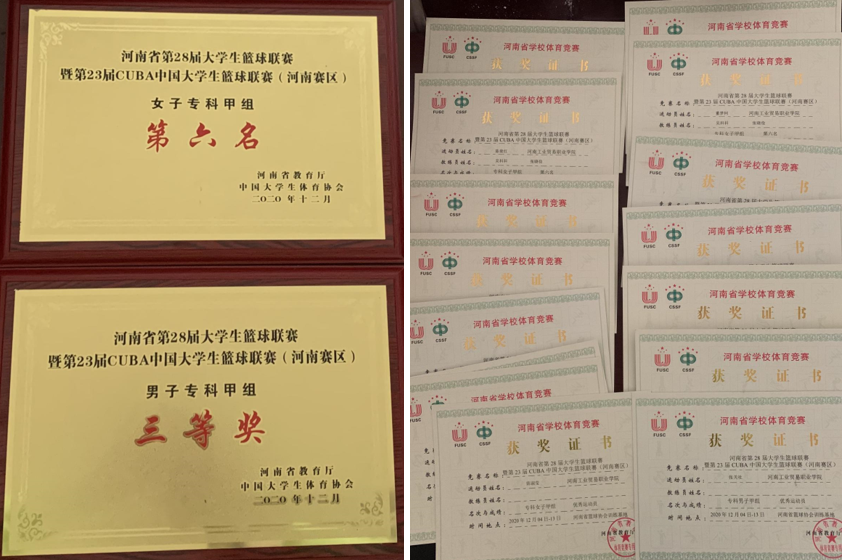 在“河南省第 28 屆大學生籃球聯賽暨第 23 屆 CUBA 中國大學生籃球聯賽”中,基礎理論教學部體育教研室吳科科、張曉儉等老師指導訓練的籃球代表隊分別獲得“女子組專科甲組第六名”、“男生組獲得了專科甲組三等獎”的好成績;吳科科獲得“優秀教練員”榮譽稱號;張關社、郭申奧、馬賀龍、陳俊紅、陳淑瑩、胡肖艷等同學獲得“優秀運動員”稱號。