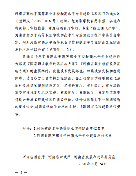據悉,為深入貫徹落實《國家職業教育改革實施方案》和全省教育大會精神,全面落實《河南省職業教育改革實施方案》,進一步加強職業院校內涵建設,實現職業教育高質量發展,省教育廳、省財政廳和省發展改革委決定啟動實施河南省高水平高等職業學校和高水平專業建設工程(簡稱“高職雙高工程”)。按照建設教育強省和辦好新時代職業教育的新要求,重點建設一批高水平高等職業學校和高水平專業群,是打造中部地區技術技能人才培養高地的重要舉措,是提升我省高素質技術技能人才培養質量的重要步驟,是我省辦好新時代職業教育的重要途徑。