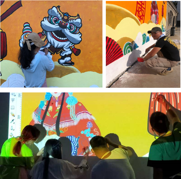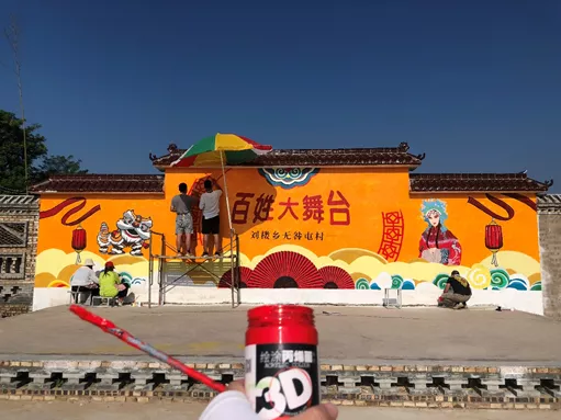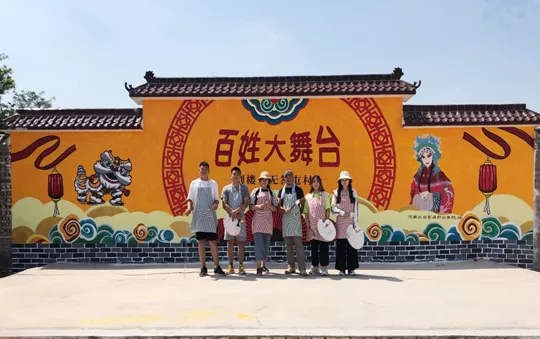 藝術(shù)設(shè)計(jì)系師生此次承擔(dān)的幫扶工作是村文化廣場(chǎng)舞臺(tái)背景的墻繪藝術(shù)創(chuàng)作。師生們充分發(fā)揮專業(yè)特長(zhǎng),設(shè)計(jì)繪制了長(zhǎng)12米、高2.6米的舞臺(tái)背景墻。