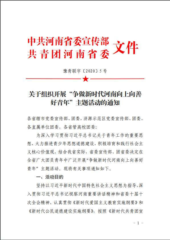 為深入學習宣傳貫徹習近平總書記關于青年工作的重要思想,大力推進青年思想道德建設,積極培育和踐行社會主義核心價值觀,省委宣傳部、團省委深入開展2020年“爭做新時代河南向上向善好青年”主題活動,面向全省廣大團員青年評選五類100名優秀青年。