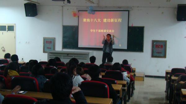 為引導青年學生全面解讀黨的十八大會議精神。了解我國科學發展的新成就,進一步堅定青年學生跟黨走中國特色社會主義道路的理想信念,增強廣大學生的政治責任感和歷史使命感,院團委于2012年11月15日在學院招聘會議室舉辦“聚焦十八大,建功新征程”主題坐談交流活動。