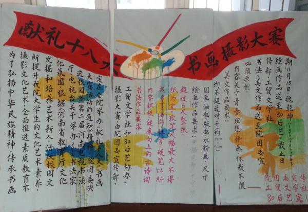 二、10月下旬,舉辦了“獻(xiàn)禮十八大”書(shū)法繪畫(huà)攝影比賽活動(dòng)。為慶祝十八大的順利召開(kāi),我院團(tuán)委組織開(kāi)展了書(shū)法繪畫(huà)評(píng)選活動(dòng),全院學(xué)生積極參與,用書(shū)法和繪畫(huà)表達(dá)了對(duì)祖國(guó)未來(lái)的深深祝福。