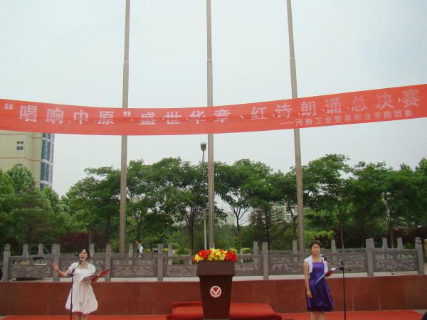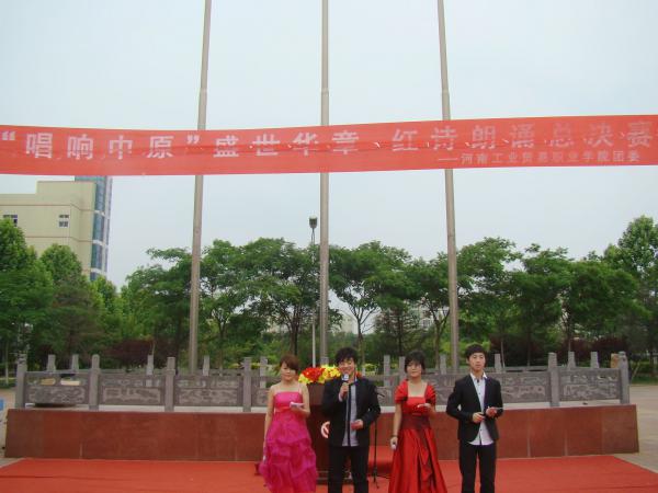 在生機勃發的五月底,在蒲公英飄飛的日子里,河南工業貿易職業學院紅旗廣場彩旗飄揚,號鼓嘹亮,全校師生歡聚一堂,為慶祝“建黨90周年”,弘揚中原文化,激發我院青年熱愛祖國,為實現中原崛起貢獻力量,我院開展了“唱響中原 盛世華章”紅詩朗誦比賽活動。此次比賽活動歷時一個月,在全院掀起了大學生讀紅詩、誦經典的熱潮。