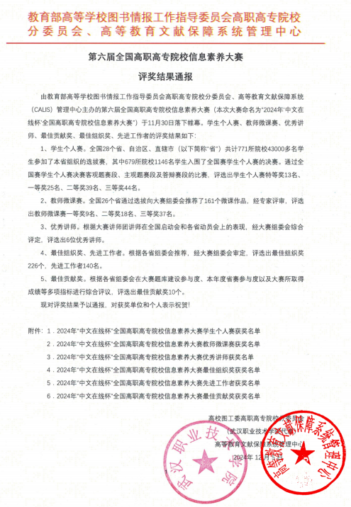 近日,由教育部高等學(xué)校圖書(shū)情報(bào)工作指導(dǎo)委員會(huì)高職高專(zhuān)院校分委員會(huì)、高等教育文獻(xiàn)保障系統(tǒng)(CALIS)管理中心主辦,陜西工業(yè)職業(yè)學(xué)院承辦的2024年(第六屆)全國(guó)高職高專(zhuān)院校信息素養(yǎng)大賽落下帷幕,我校在此次大賽中斬獲國(guó)賽二等獎(jiǎng)。
