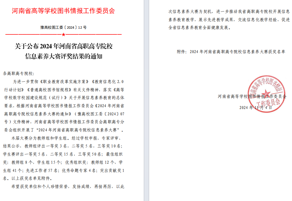 根據(jù)河南省高校圖書(shū)情報(bào)工作委員會(huì)下發(fā)的《關(guān)于舉辦2024年河南省高職高專(zhuān)院校信息素養(yǎng)大賽的通知》要求,我校圖書(shū)館聯(lián)合學(xué)生處共同組織籌劃此次賽事,經(jīng)過(guò)三個(gè)多月的共同努力,圓滿(mǎn)完成了大賽的各項(xiàng)工作,最終取得省賽和國(guó)賽多項(xiàng)榮譽(yù)。