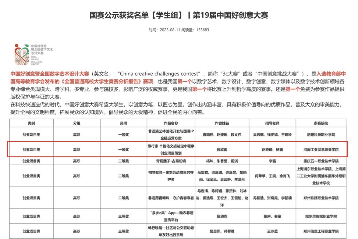 近日,第19屆中國好創(chuàng)意暨全國數(shù)字藝術(shù)設(shè)計(jì)大賽(China Creative Challenges Contest,簡稱“3C大賽”或“中國創(chuàng)意挑戰(zhàn)大賽”)【學(xué)生組】全國總決賽圓滿落幕。我校師生首次參賽,憑借創(chuàng)業(yè)項(xiàng)目類作品《豫行家--個性化文化旅游制定小程序創(chuàng)業(yè)項(xiàng)目策劃》斬獲國賽一等獎。