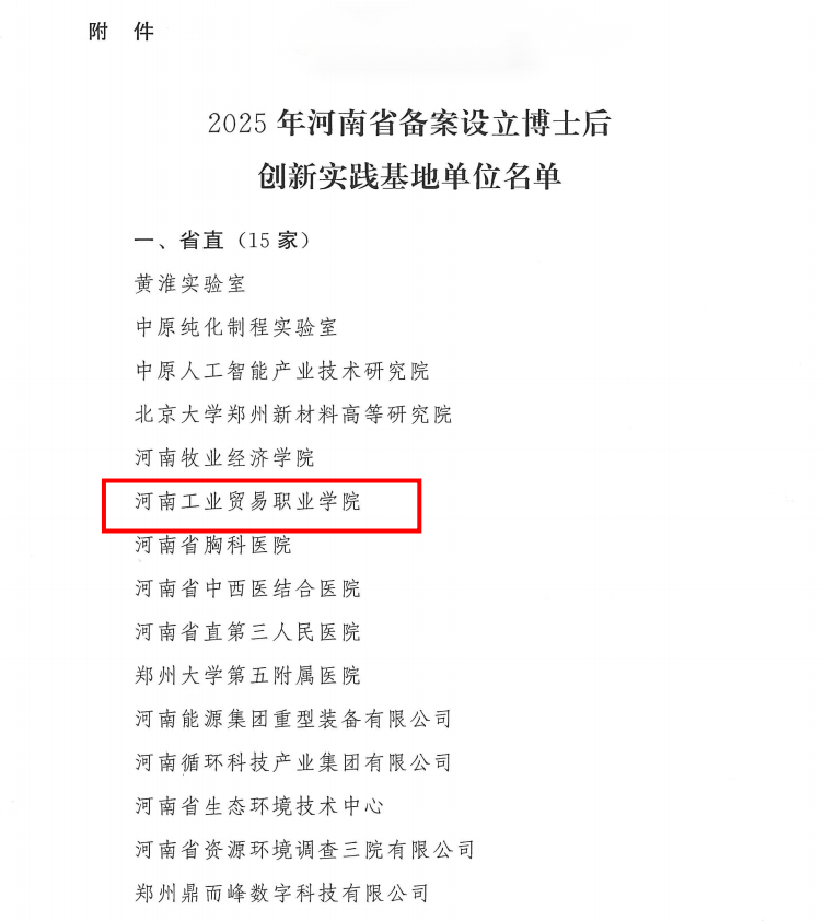 近日,河南省人力資源和社會保障廳公布2025年河南省備案設立博士后創新實踐基地單位名單,我校憑借在人才培育、科研攻關與產教融合領域的扎實積累成功入選。這一成果既是河南省人力資源和社會保障廳對我校高層次人才工作與辦學實力的高度認可,更是學校踐行“服務糧食安全、賦能商貿發展”辦學使命,推進“人才強校、科研興校”戰略的重要里程碑,標志著我校在高層次人才“引、育、用、服”全鏈條建設與科技創新平臺發展上邁入新階段。