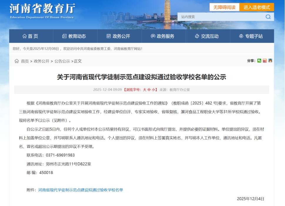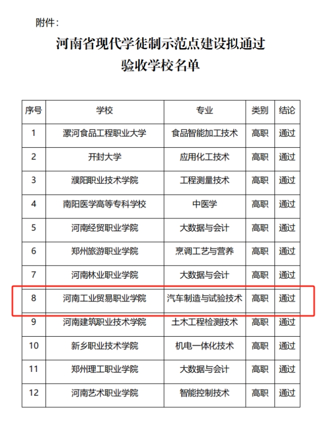 近日,根據《河南省教育廳辦公室關于開展河南省現代學徒制示范點建設驗收工作的通知》(教職成函〔2025〕482號)要求,省教育廳開展了第三批河南省現代學徒制示范點建設實地驗收工作,并對驗收通過名單予以公示,我校汽車工程學院汽車制造與試驗技術專業(yè)作為河南省現代學徒制試點單位,順利通過驗收。