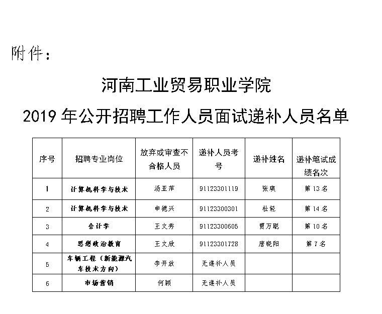 附件:河南工業(yè)貿(mào)易職業(yè)學(xué)院2019年公開招聘工作人員面試遞補人員名單