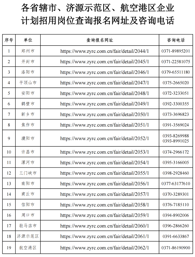 本次招用采取線上報名方式,自本公告發布之日起報名,招滿即止。各省轄市、濟源示范區、航空港區企業招用崗位查詢報名網址及咨詢電話見附件2。報名人員應仔細閱讀公告及相關附件,全面了解崗位要求,自行判斷是否具備相應條件,避免錯報。