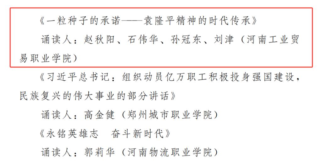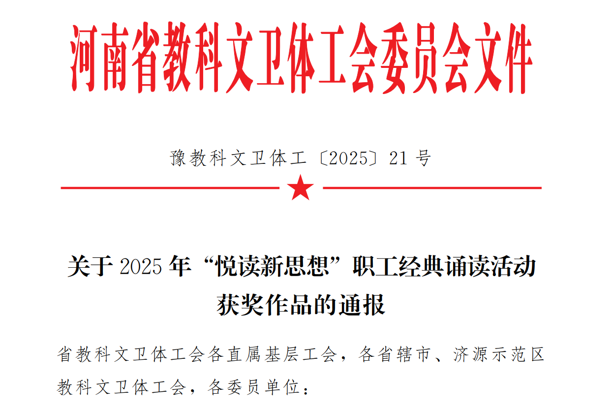 11月6日,我校作品《一粒種子的承諾———袁隆平精神的時代傳承》獲河南省總工會2025年“悅讀新思想”河南省職工經典誦讀活動長視頻類優秀獎。