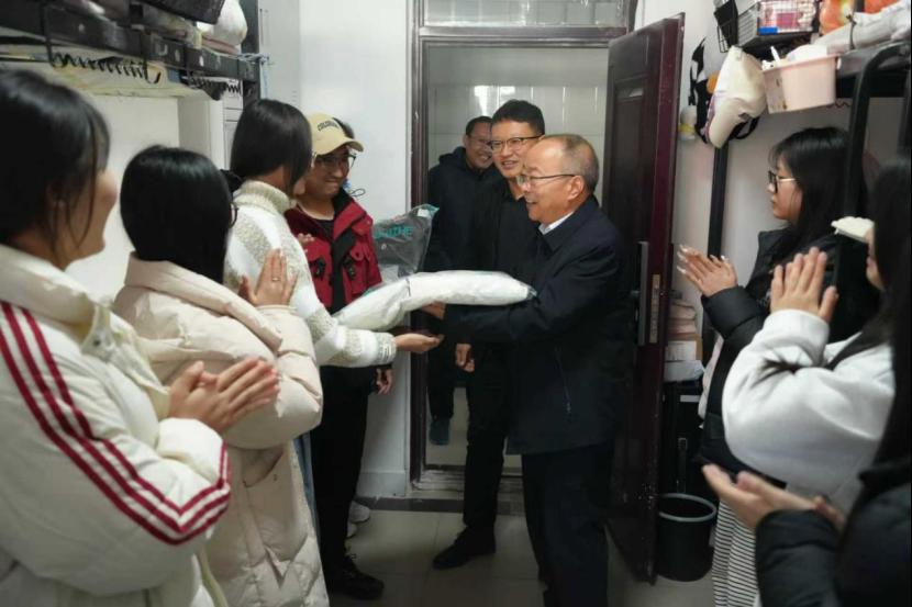 12月10日中午,我校黨委書記李國峰、黨委副書記柴瑞帥帶隊,深入龍湖校區3號學生宿舍樓,開展“冬日送溫暖”御寒棉衣發放活動。