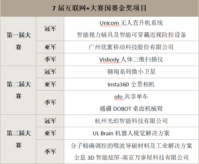 從7屆“互聯網+”大賽國賽金獎項目,不難看出高端新材料(如第三屆、第四屆季軍項目)、芯片(如第六屆季軍、第七屆冠軍項目)、智能制造與機器人技術(如第一屆冠軍、第三屆亞軍、第五屆冠軍、第七屆亞軍項目)等一直深受評委喜愛。