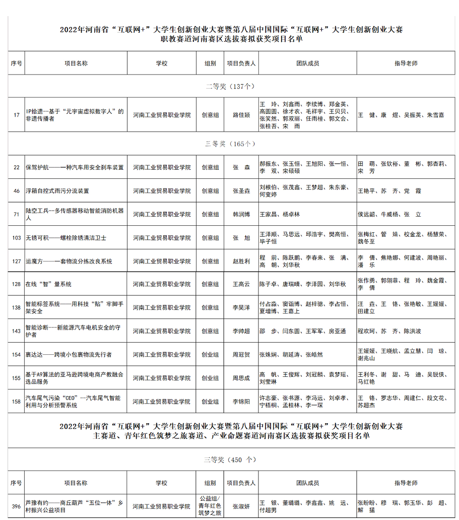 比賽經過緊張激烈的角逐,最終我校藝術設計學院“IP拾遺—基于‘元宇宙虛擬數字人’的非遺傳播者”項目團隊入圍省賽決賽現場并取得職教賽道二等獎的歷史最好成績;糧食工程學院“在線‘智’量系統”、機電工程學院“運魔方—一套物流分揀改良系統”、“智能診斷—新能源汽車電機安全的守護者”、“浮箱自控式雨污分流裝置”、“陸空工兵-多傳感器移動智能消防機器人”,汽車工程學院“保駕護航—一種汽車用安全剎車裝置”、“汽車尾氣污染‘CEO’—汽車尾氣智能利用與分析預警系統”、“無銹可積—螺栓除銹清潔衛士”,信息工程學院“智能標簽系統—用科技‘貼’牢腳手架安全”、工商管理學院“裹達達—跨境小包裹物流先行者”、經濟貿易學院“基于A9算法的亞馬遜跨境電商產教融合選品服務”等11個項目團隊榮獲職教賽道三等獎;藝術設計學院“蘆豫有約—商丘葫蘆‘五位一體’鄉村振興公益項目”榮獲紅旅賽道三等獎。我校在大賽組織工作中表現突出,榮獲“優秀組織獎”。