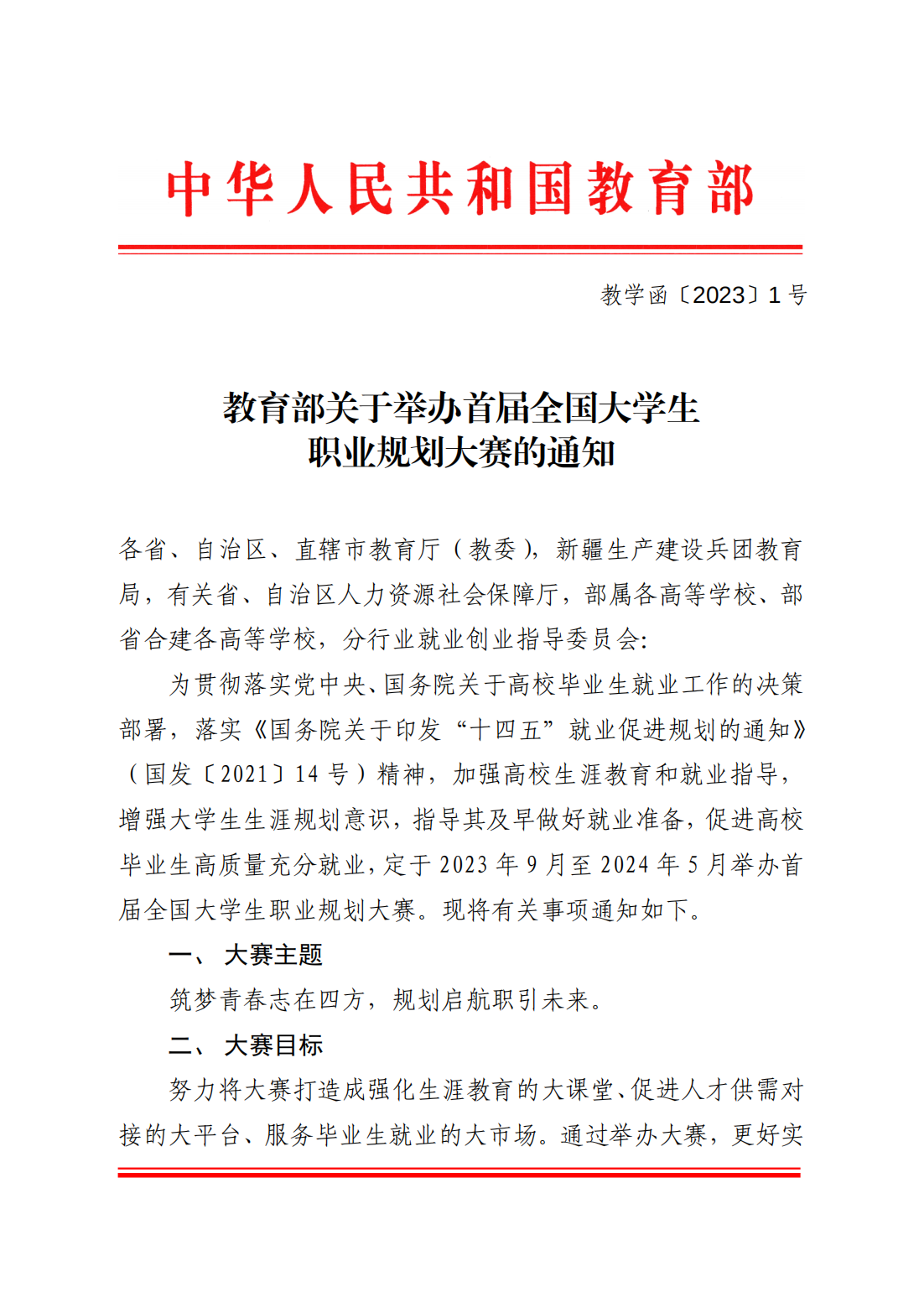 教育部關(guān)于舉辦首屆全國(guó)大學(xué)生職業(yè)規(guī)劃大賽的通知