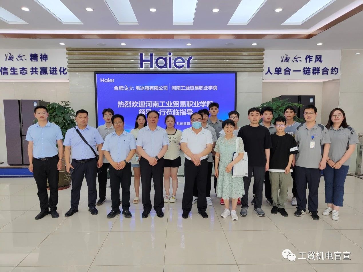 5月19日,河南工業貿易職業學院黨委書記劉合行,教學管理處處長李強、經濟貿易學院院長張素勤、學院辦公室副主任陳建濤一行4人,到合肥海爾電冰箱有限公司親切看望我校機電類專業實習學生,并就校企合作工作進行深入溝通交流。合肥海爾電冰箱副總經理趙智斌、生產部長王元、創客中心人力資源經理儲貽成等陪同參觀座談。
