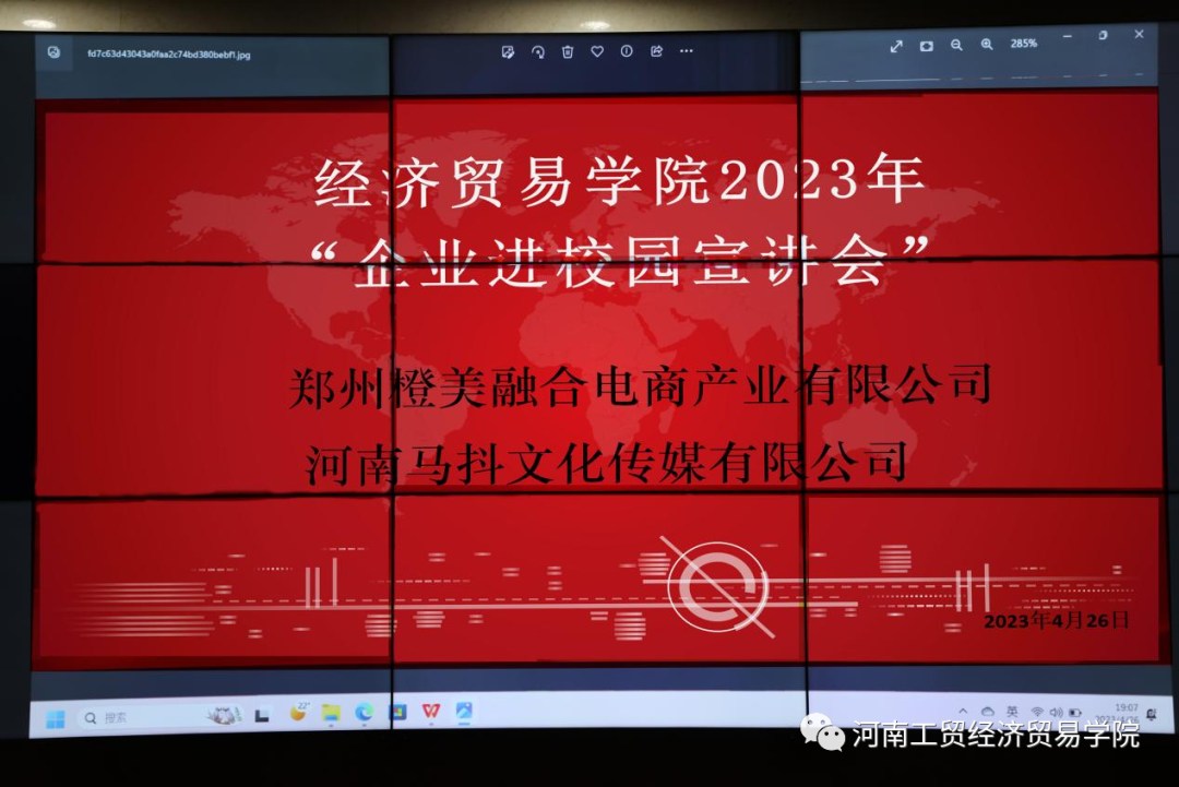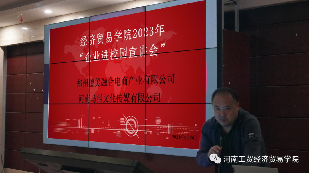 4月26日,為深入開(kāi)展校企合作,促進(jìn)學(xué)生實(shí)習(xí)就業(yè),經(jīng)濟(jì)貿(mào)易學(xué)院2023年“企業(yè)進(jìn)校園宣講會(huì)”系列第二場(chǎng)活動(dòng)在3301階梯教室舉行。鄭州橙美融合電商產(chǎn)業(yè)有限公司、河南馬抖文化傳媒有限公司的相關(guān)負(fù)責(zé)人為2021級(jí)近300名學(xué)生進(jìn)行企業(yè)文化和招聘要求的宣講。