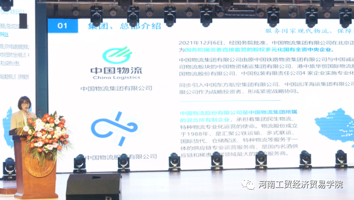 綜合管理部經(jīng)理喬蕾從公司發(fā)展概況、發(fā)展戰(zhàn)略、企業(yè)文化三個方面為同學們介紹中物流集團公司等綜合情況;員工代表業(yè)務主管張翔嘉通過講述個人的就業(yè)成長經(jīng)歷和在甘肅嘉峪關(guān)的物流配送、倉儲項目體驗,和同學們做了職場規(guī)劃與分享,他鼓勵同學們“紙上得來終覺淺,絕知此事要躬行”。最后,人力資源部主管湯晶介紹了實習生招聘標準、面試技巧,現(xiàn)場進行了測試和綜合答疑。