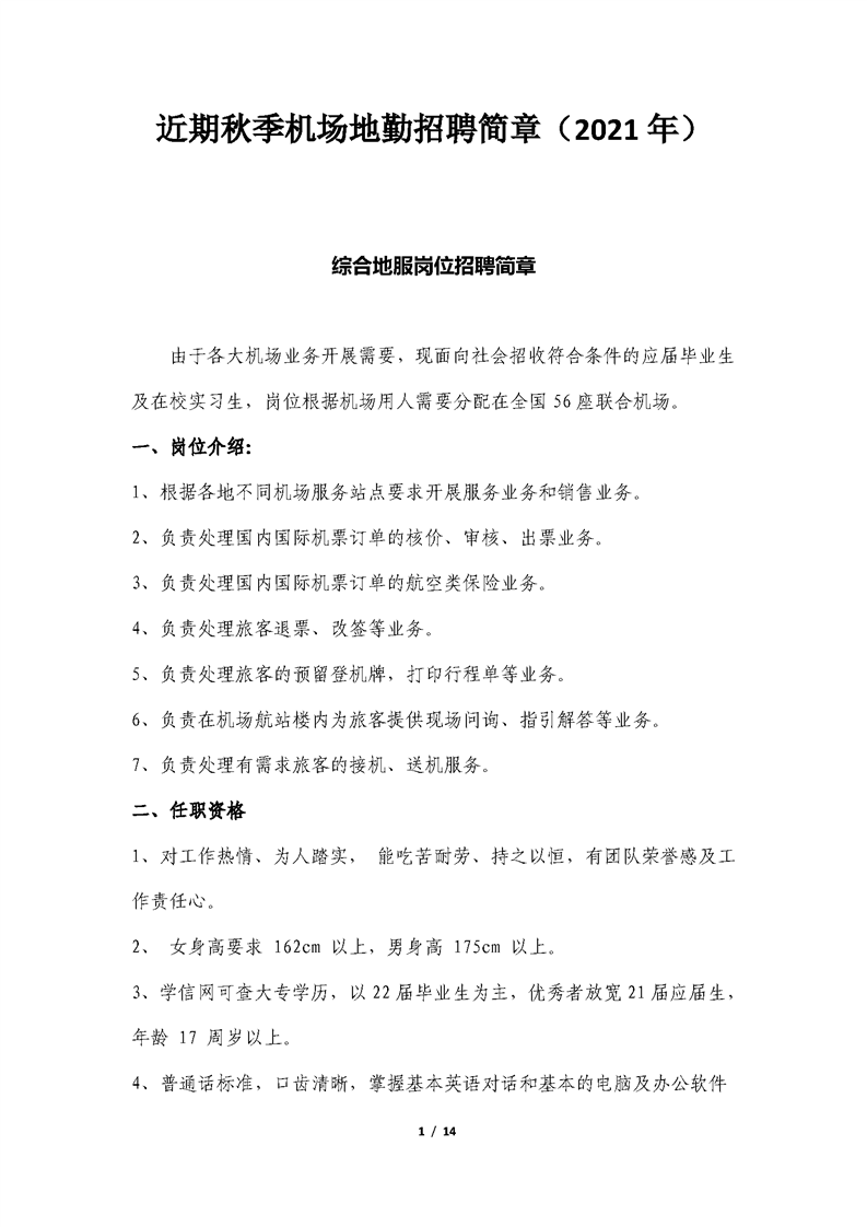 近期秋季機(jī)場地勤招聘簡章(2021年)