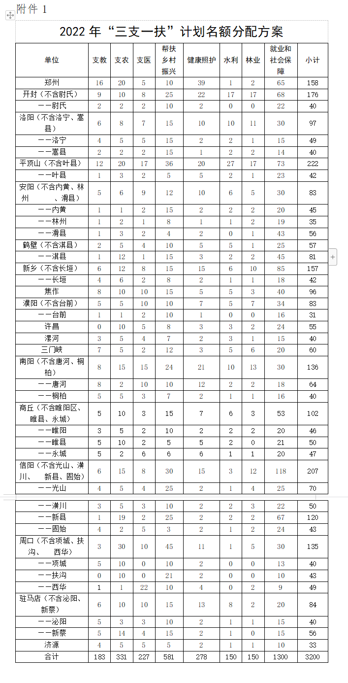 根據中共河南省委組織部、中共河南省委機構編制委員會辦公室、河南省人力資源和社會保障廳、河南省財政廳等聯合印發《關于實施第四輪高校畢業生“三支一扶”計劃的通知》、《關于做好2022年高校畢業生“三支一扶”計劃實施工作的通知》和河南省人力資源和社會保障廳《關于印發<河南省2022年高校畢業生“三支一扶”計劃招募工作方案>的通知》精神,現將我省2022年高校畢業生“三支一扶”計劃招募工作有關事項公告如下: