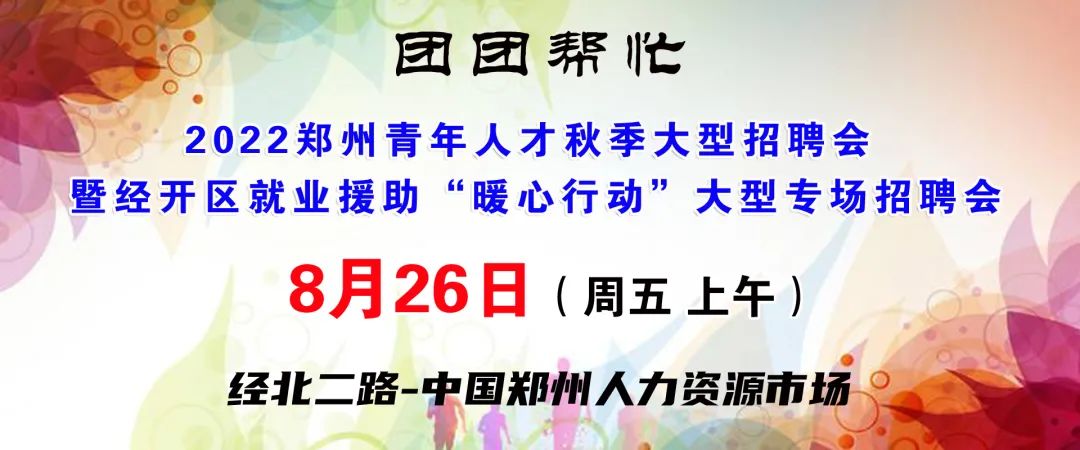 8月26日 團團幫忙·2022鄭州青年人才秋季大型招聘會暨經開區就業援助“暖心行動”大型專場招聘會,120家企業,提供1.25萬個就業崗位!