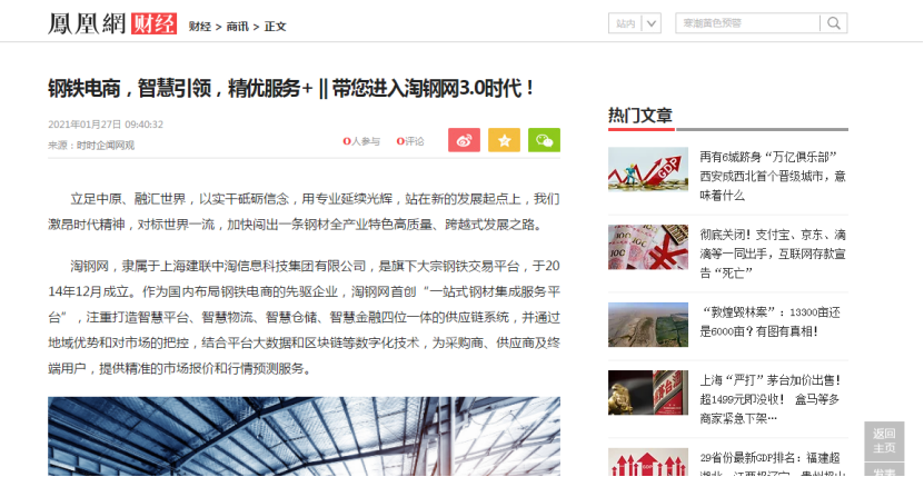 淘鋼網憑借過硬質量和可靠服務,合作了多個“高速公路、地鐵市政、國企事業單位”等項目工程,并先后榮獲“互聯網+創新創業示范單位”、獲多次“中國B2B企業百強"等諸多企業榮譽,網易新聞、新浪新聞、鳳凰網、中國經濟日報網等多家官方媒體相互報道,從此淘鋼網為全國鋼材電商開啟了新征程。