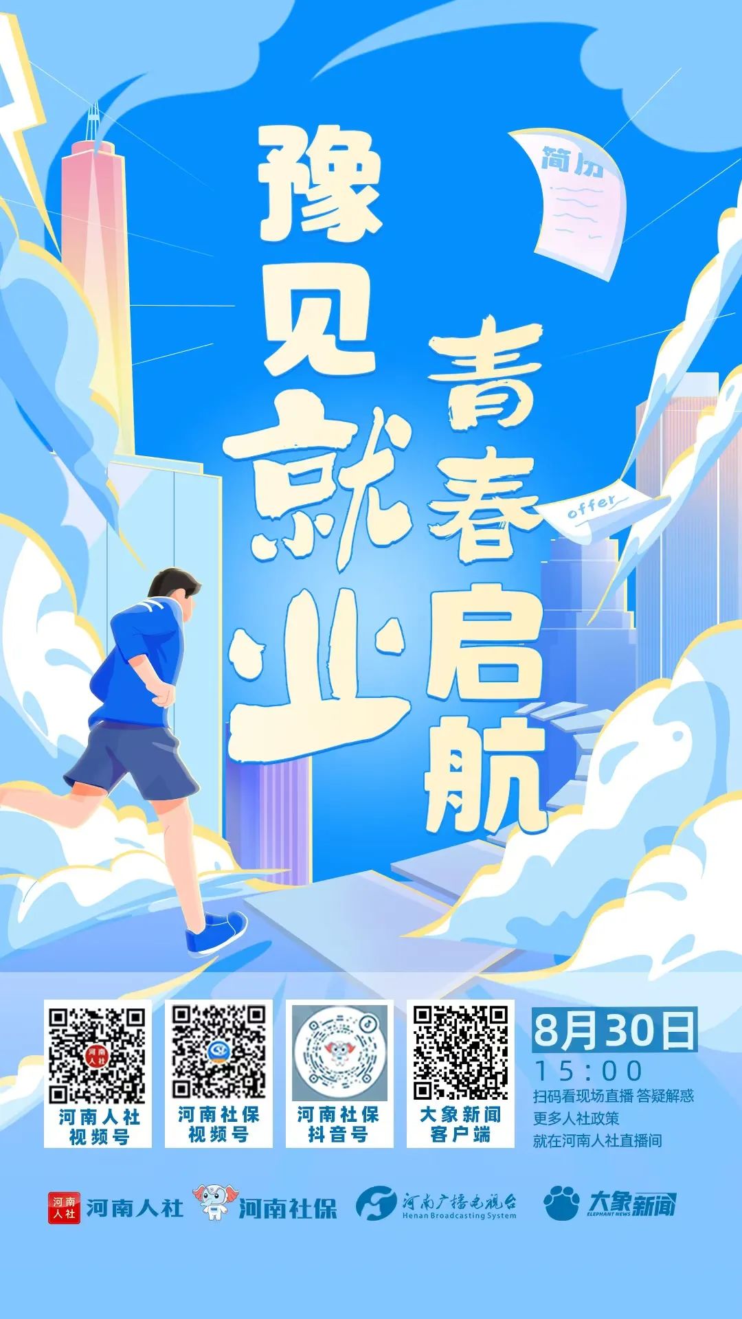 8月30日下午3點,省人力資源社會保障廳就業促進局負責同志將作為首期嘉賓走進直播間,介紹高校畢業生等青年群體就業創業政策并回答網友提問。河南人社視頻號、河南社保視頻號、河南社保抖音號、大象新聞客戶端、河南新聞廣播視頻號、河南之聲微博等平臺同步直播,敬請關注!