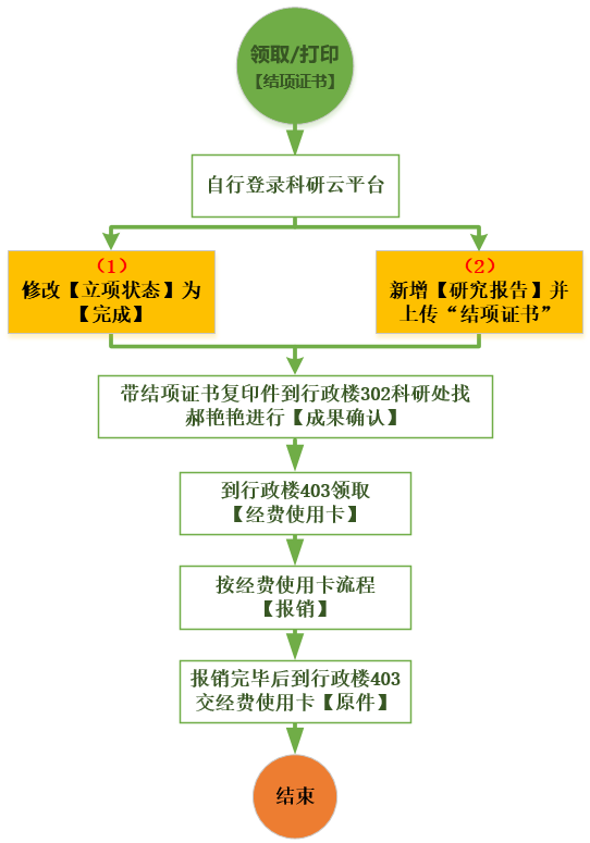 課題主持人領(lǐng)取或打印課題【結(jié)項證書】后,完成以下操作就可到科研處領(lǐng)取經(jīng)費使用卡,根據(jù)經(jīng)費使用卡上規(guī)定的相關(guān)要求報銷學(xué)校配套的課題經(jīng)費。