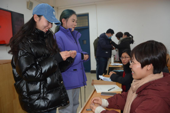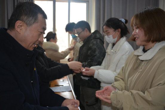 由糧食工程學院教師黨員向本次會議接收的預備黨員同志和按期轉正的同志分發黨員徽章。