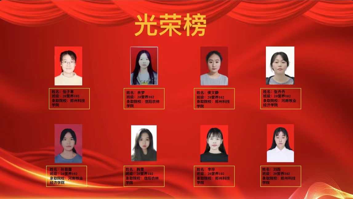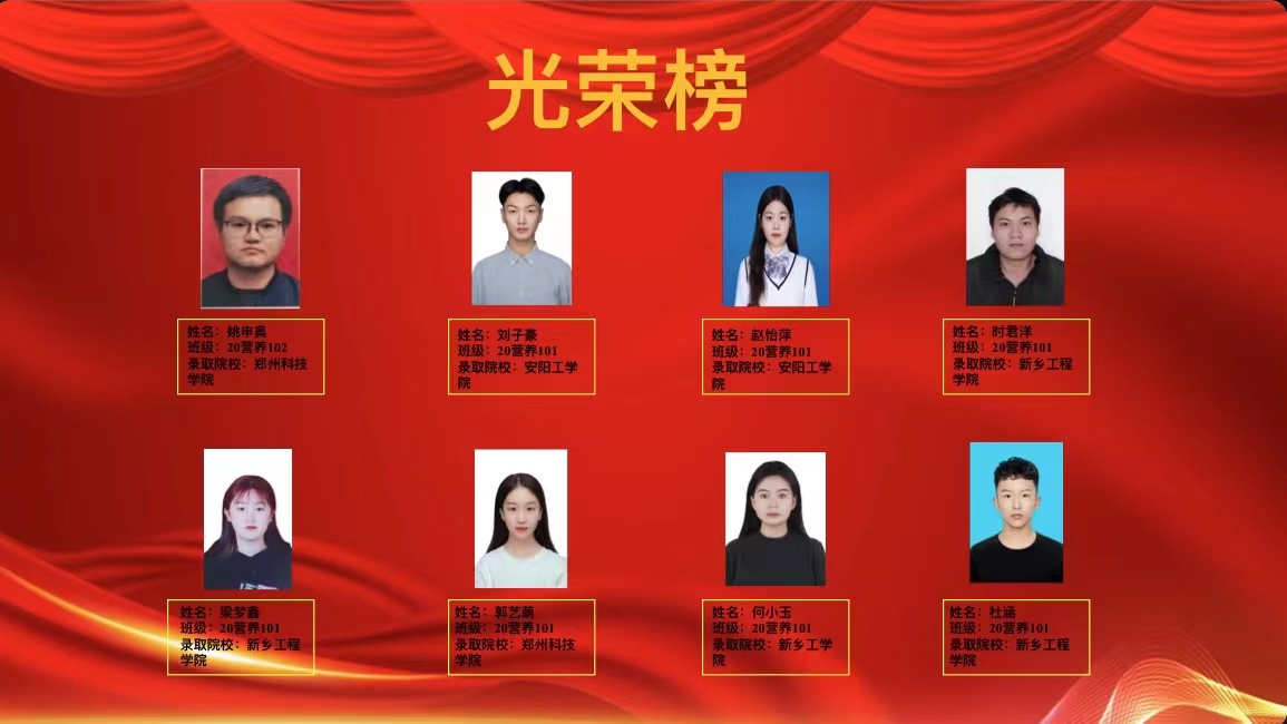 今年我院共有2023屆畢業(yè)生176人,最終報考專升本72人,報考比例40.9%。最終被河南牧業(yè)經濟學院、信陽農林學院、安陽工學院、新鄉(xiāng)工程學院、鄭州科技學院、鄭州工程技術學院等本科院校錄取46人,錄取率為63.9%,遠高于我校平均錄取率42.34%和河南省平均錄取率38.09%。