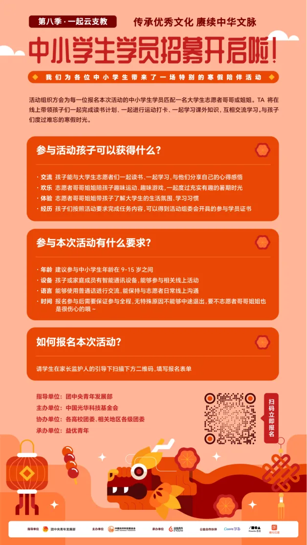 一、 活動背景 為全面學習宣傳貫徹黨的二十大精神,深入貫徹習近平總書記關于青年工作的重要思想,落實團中央書記處有關工作部署,由共青團中央青年發展部作為指導單位,中國光華科技基金會作為主辦單位,益優青年作為承辦單位,組織開展以“傳承優秀文化,賡續紅色血脈”為主題的“全國大學生2024年寒假“返家鄉”社會實踐一起云支教專項活動。