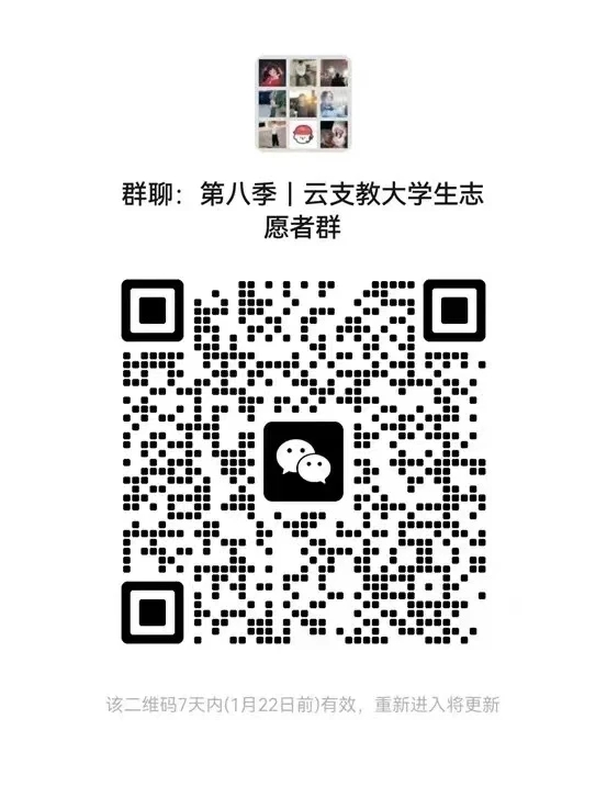 5、 社區中小學生報名 為使本次云支教活動所對接的中小學生生源更加穩定可靠,每位同學可動員自己所在家庭/社區的弟弟妹妹參與本次活動。掃描二維碼