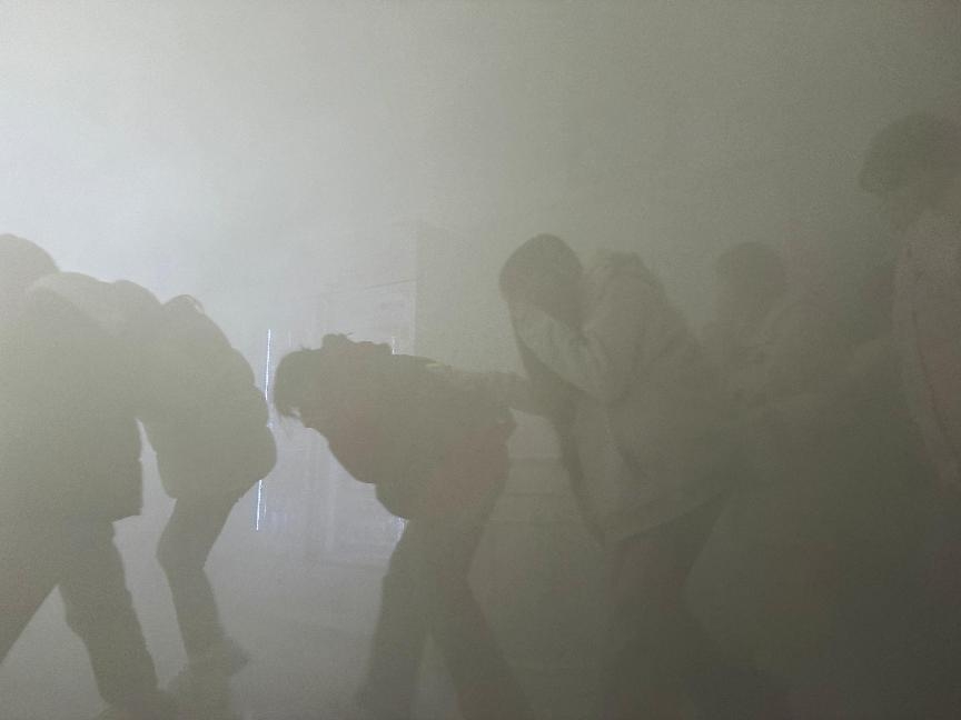 活動伊始,保衛處劉國慶老師向同學們詳細講解了消防應急處置相關知識、滅火器的功能與使用步驟、逃生演練注意事項等,并現場演示了滅火器的正確使用方法,確保大家能夠熟練掌握消防技能。隨著工作人員發散濃煙、警報聲起,學生干部按照演練要求迅速組織學生用濕毛巾捂口鼻、彎腰低姿,沿預定路線有序撤離宿舍。疏散過程中,引導老師在關鍵位置引導,保障同學們安全,全體同學在短時間內疏散至安全區域。