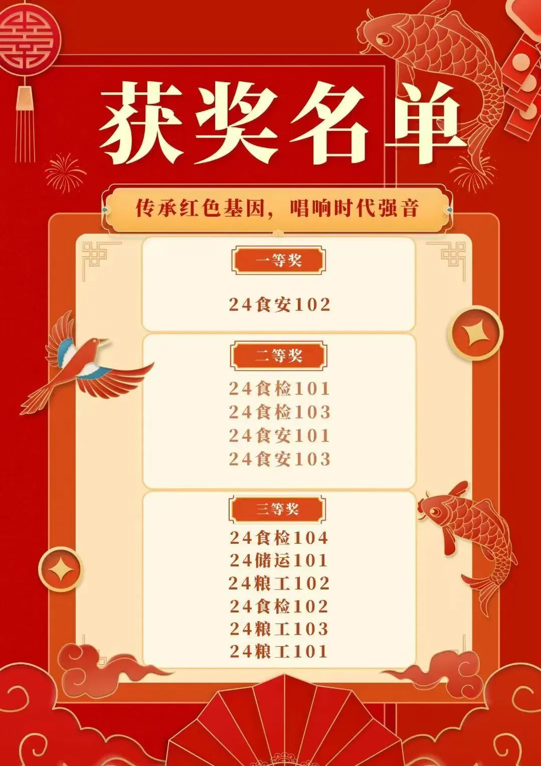 評委們從演唱技巧、舞臺表現力、歌曲編排等多個方面對參賽隊伍進行了綜合評分。經過激烈的角逐,最終評選出了一、二、三等獎。24食安102班憑借出色的發揮,榮獲本次比賽的一等獎,他們帶來的《歌唱祖國》和《我相信》,將對祖國的深情與青春的活力完美融合,展現出了新時代青年對祖國的熱愛與擔當。