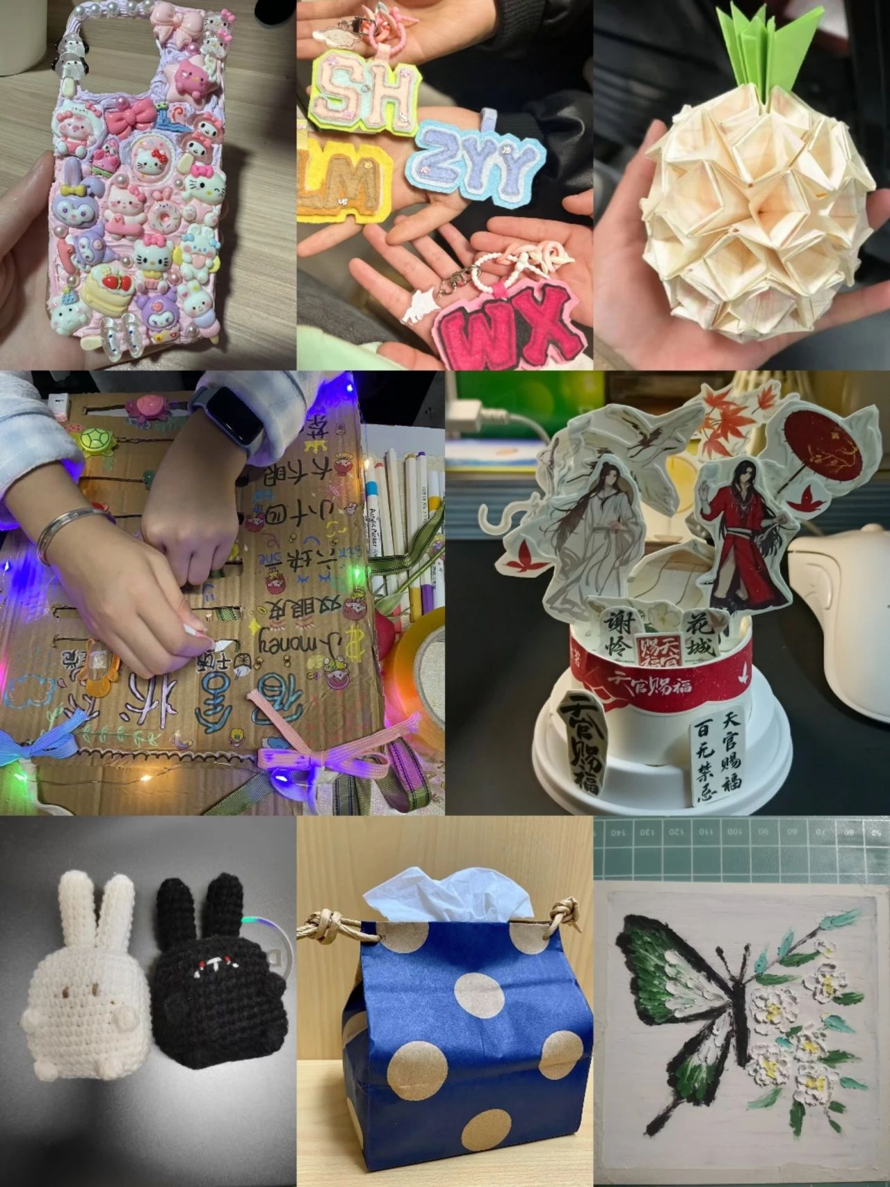 在手工作品征集活動中,糧食工程學院的同學們展現出非凡的創造力與動手能力,用雙手打造出一件件精美的手工作品。有色彩明快、圖案別致的手機殼;可愛精致的字母毛氈鑰匙扣;造型逼真的折紙菠蘿;筆觸細膩、栩栩如生的蝴蝶油畫。從毛氈小掛件,到個性紙巾盒;從鉤織的萌趣小兔,到滿是可愛元素的手機殼……作品涵蓋繪畫、編織、手工制作等多種形式,巧妙將創意與勞動相結合。每一件作品都凝聚著同學們的心血,是勞動與創意碰撞出的璀璨火花。