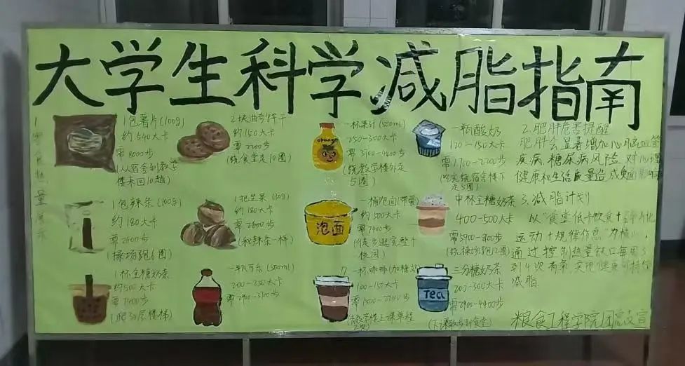 同時,考慮到我院學生群體對健康減脂的關注與需求,學生們還專項設計了以 “大學生減脂指南” 為主題的科普展板。該展板深入分析了大學生在減脂過程中常見的誤區,詳細介紹了科學減脂的方法,如合理的熱量攝入計算、減脂期間優質食物的選擇等內容。通過這些展板的展示,有效地提升了同學們對 “科學膳食,健康生活” 的認知水平,讓更多同學意識到科學膳食對于保持身體健康、提升生活質量的關鍵意義,進而引導大家在日常生活中養成良好的飲食習慣。