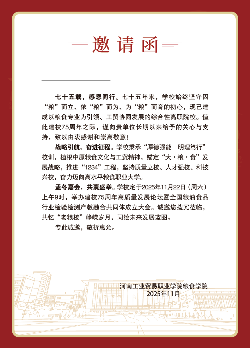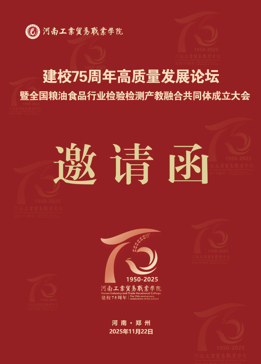 建校75周年高質(zhì)量發(fā)展論壇暨全國(guó)糧油食品行業(yè)檢驗(yàn)檢測(cè)產(chǎn)教融合共同體成立大會(huì)誠(chéng)邀各位校友蒞臨
