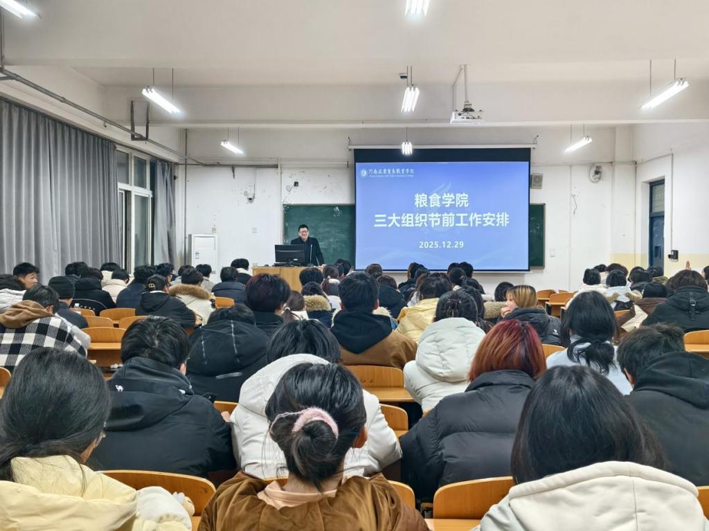 為進(jìn)一步凝聚學(xué)生力量、規(guī)范日常管理、部署節(jié)前相關(guān)工作,12 月 29 日,糧食學(xué)院在 3106 教室召開三大組織節(jié)前任務(wù)安排會議。學(xué)生黨支部書記夏文龍主持會議,學(xué)院三大組織相關(guān)成員參會。會議旨在延續(xù)學(xué)院優(yōu)良傳統(tǒng),通過推行標(biāo)準(zhǔn)化管理等舉措,為學(xué)生成長成才搭建更公平、更廣闊的平臺。