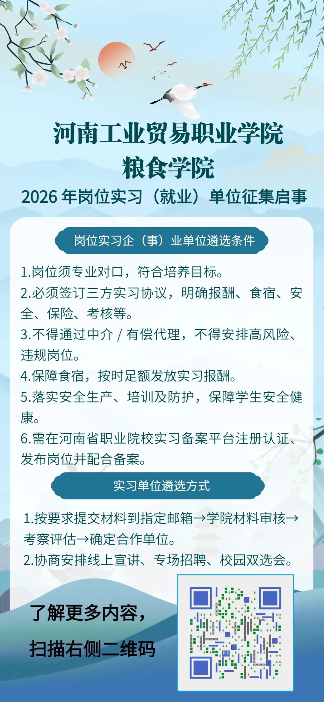 河南工業(yè)貿(mào)易職業(yè)學(xué)院糧食學(xué)院征集 2026 年崗位實(shí)習(xí)(就業(yè))單位的啟事