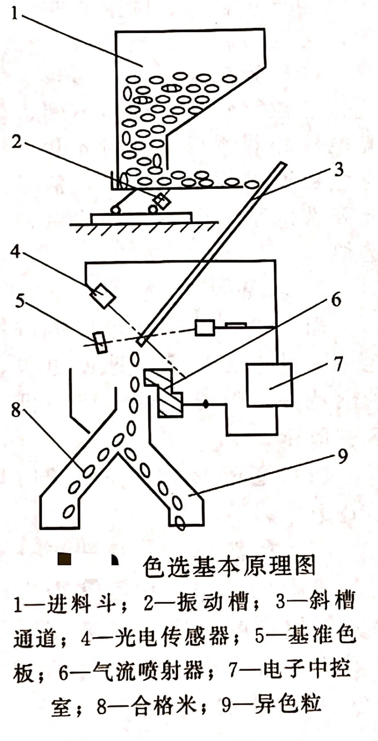 二、色選機的工作過程色選機的基本工作過程如圖所示。當含有異色物質的白米由進料斗經振動喂料器輸送到對應的通道,沿通道均勻下落:物質進人選別區域(色選室)時,被選物料在光電探測器、基準色板之間通過。當異色糧粒通過色選區域時,信號值超出基準色板的設定區域值,中控室命令驅動噴射系統驅動該通道的噴嘴動作,壓縮空氣將異色粒吹出,落入剔除斗,為不合格米;而正常米粒在通過色選區域時,信號差值在基準色板設定區域值內,驅動噴射系統噴嘴不動作,物料會沿原來方向繼續下落進入接收料斗,成為合格米,完成色選過程。