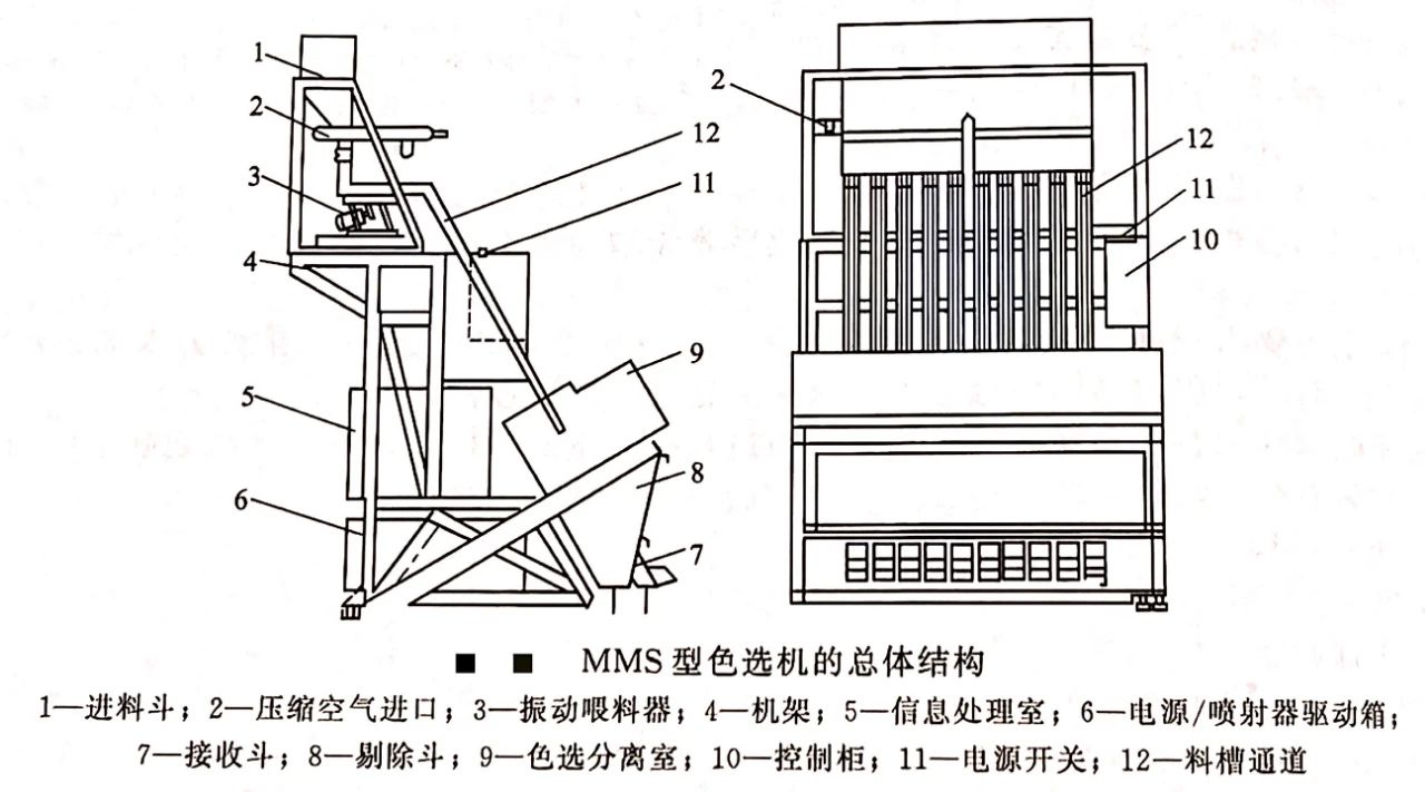 色選機在面粉廠和米廠有廣泛的應用,可以通過小麥或大米與雜質的顏色不同來分離雜質。下面以MMS型大米色選機為例來講解其結構、工作原理和操作注意事項。MMS型色選機的總體結構如圖所示,主要由進料斗、振動喂料器、料槽通道、分選室、噴射器驅動箱、氣動系統和信息處理箱等組成。