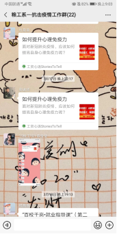 二、凝心聚力,及時傳遞學校關愛囑托。新型冠狀病毒感染肺炎疫情防控工作正處在關鍵期,日益嚴峻的疫情牽動著每一位老師和學生的心。糧工系老師向學生們及時傳達疫情發展情況,增強學生自我防護意識,做好自身防護措施,及時、科學、有效地應對疫情,并明確要求廣大同學自覺遵從政府相關部門和學校有關要求,盡量減少外出,不要提前返校。