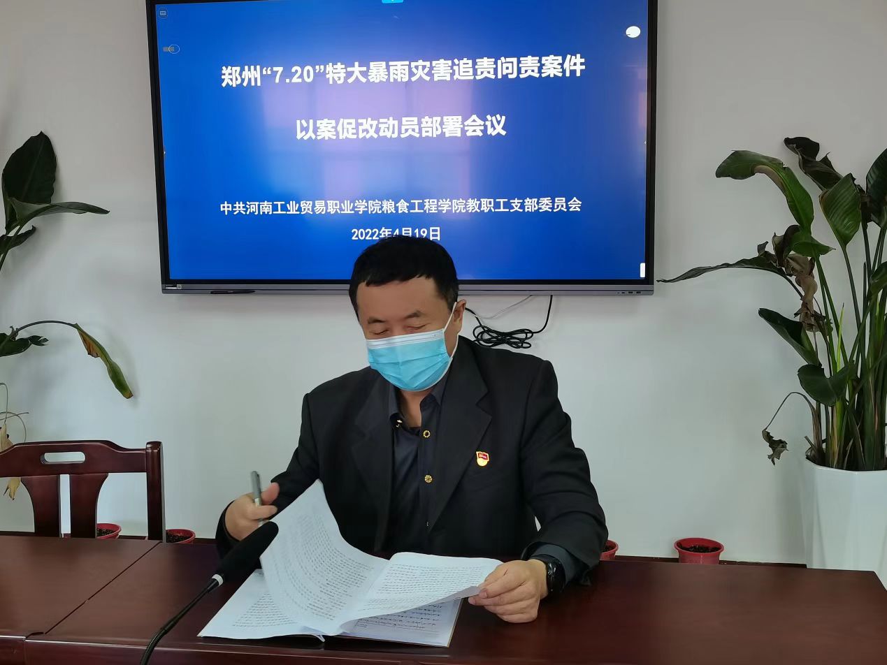 4月19 日上午,糧食工程學院教職工黨支部在圖書館A9012召開鄭州“7.20”特大暴雨災害追責問責案件以案促改工作動員部署會議。會議由郭天松書記主持,支部6名黨員到會。