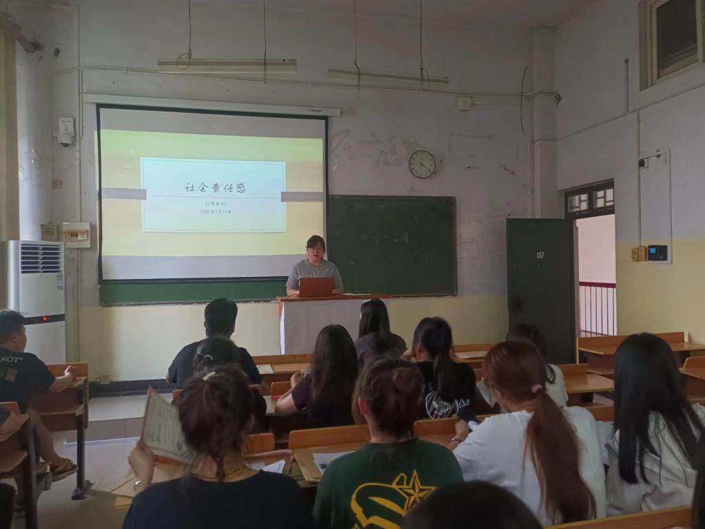 主題班會上,輔導員老師通過PPT的展示,明確大學生的社會責任,就如何結合自身學習和生活踐行并提高自己的社會責任意識和能力等問題進行總結,并鼓勵同學們要認真規劃自己的大學生生活,樹立崇高理想,努力提升自己的人生價值。