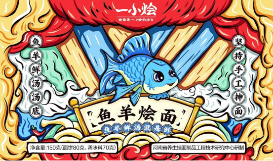 一小燴魚羊燴面及老方城燴面兩大品類分別采用國潮插畫風和鹽系質感風,突破地域風味美食的固有印象,從工藝、配料及包裝等細分項上持續優化升級,聚焦營養、健康和便捷速食,輕松滿足你對一頓正餐的所有需求。