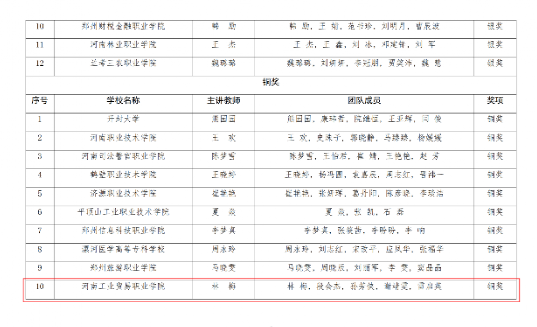 近日,第三屆全國大學生職業規劃大賽河南省賽課程教學賽道結果公示,我校林梅、段會杰、孫芳俠、謝靖雯、雷啟英五位教師榮獲職教組銅獎。