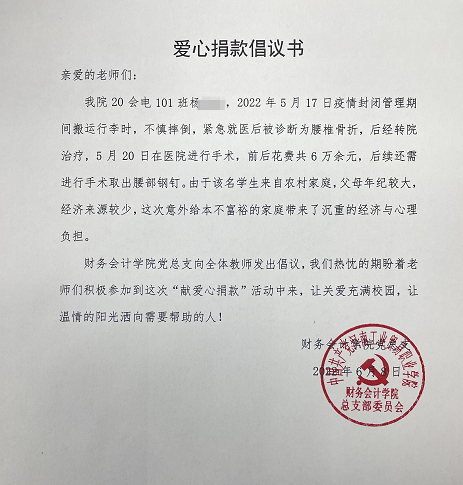 財務(wù)會計學(xué)院黨總支了解該同學(xué)的情況后,立即發(fā)起了《愛心捐款倡議書》,在圖書館B8004組織了現(xiàn)場募捐,同時發(fā)起線上募捐活動。活動得到了全體專兼職教師的積極響應(yīng),老師們紛紛伸出援助之手,短短四個小時的時間,共募集到12030元,并通過輔導(dǎo)員轉(zhuǎn)賬給該同學(xué)。