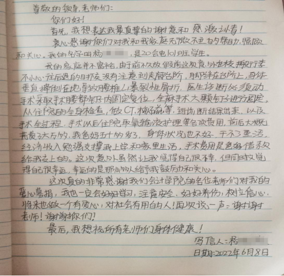 楊小薇(化名)同學(xué)收到募捐款后深受感動,雖然臥病在床但立即手寫一封感謝信,向全體伸出援手無私捐助的老師們表達感謝。她說:“老師們的溫暖關(guān)愛給了我無限的動力,讓我們一家有信心挺過這次難關(guān)。等我康復(fù)之后一定會好好學(xué)習(xí),去回報所有幫助過我的老師們!”