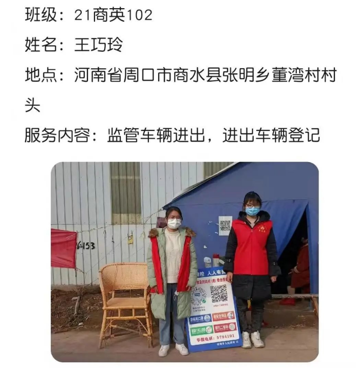 財(cái)務(wù)會(huì)計(jì)學(xué)院“青”字集結(jié),穿上紅衣戰(zhàn)甲,參與到抗疫一線中去。20級(jí)注會(huì)101班團(tuán)支書(shū)魏樂(lè)憶作為一名入黨積極分子,寒假回家后響應(yīng)政府號(hào)召,積極投入到周口市鹿邑縣家鄉(xiāng)抗疫活動(dòng)中,參加各項(xiàng)志愿服務(wù),登記返鄉(xiāng)人員信息,布置核酸檢測(cè)現(xiàn)場(chǎng),為社區(qū)防疫貢獻(xiàn)力量。